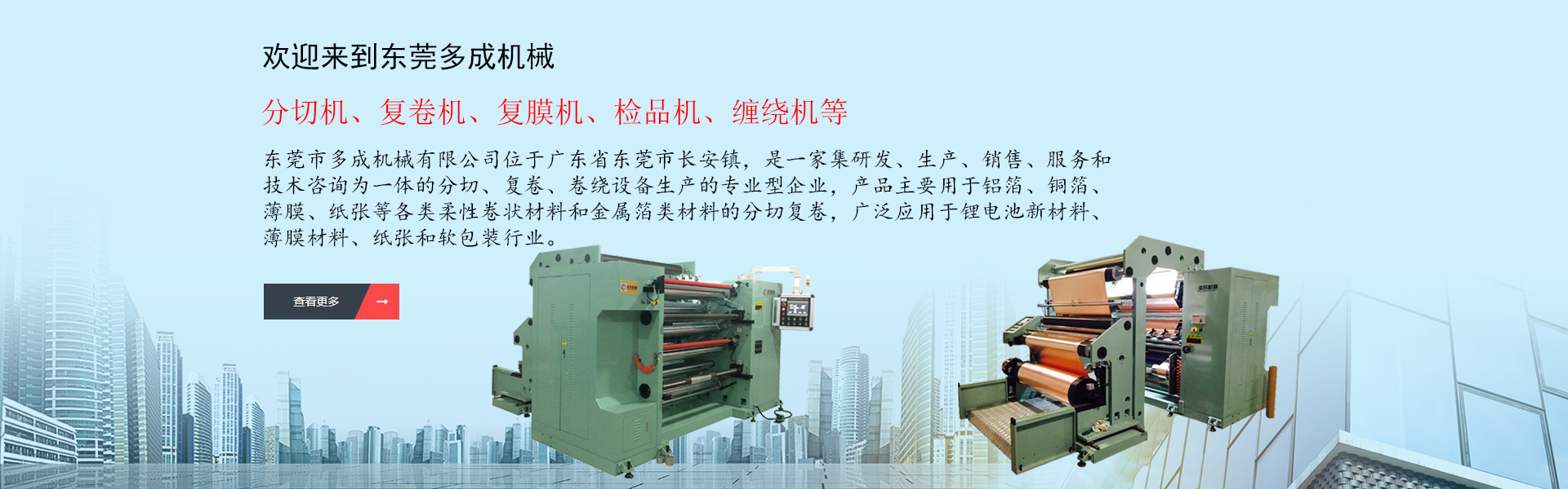 東莞市多成機(jī)械有限公司位于廣東省東莞市長(zhǎng)安鎮(zhèn),是一家集研發(fā)、生產(chǎn)、銷售、服務(wù)和技術(shù)咨詢?yōu)橐惑w的分切、復(fù)卷、卷繞設(shè)備生產(chǎn)的專業(yè)型企業(yè),產(chǎn)品主要用于鋁箔、銅箔、薄膜、紙張等各類柔性卷狀材料和金屬箔類材料的分切復(fù)卷,廣泛應(yīng)用于鋰電池新材料、薄膜材料、紙張和軟包裝行業(yè),產(chǎn)品范圍有分切機(jī)、復(fù)卷機(jī)、復(fù)膜機(jī)、檢品機(jī)、纏繞機(jī)等,是國內(nèi)外分切卷繞設(shè)備專業(yè)供應(yīng)商。